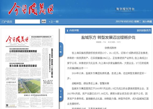 鹽城東方集團(tuán)是國(guó)家級(jí)鹽城經(jīng)濟(jì)技術(shù)開發(fā)區(qū)于20037月出資1.5億元成立的全額獨(dú)資國(guó)有企業(yè),發(fā)展至20176月底,資產(chǎn)總額已達(dá)377.06億元、擁有50家全資及控(參)股子公司,因其資產(chǎn)負(fù)債率低、直接融資占比高、納稅能力強(qiáng)、轉(zhuǎn)型升級(jí)早,成為鹽城地區(qū)國(guó)企發(fā)展標(biāo)桿,在蘇北乃至全省、上海的相關(guān)地區(qū)也產(chǎn)生了一定的影響。
