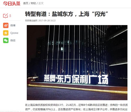 2016年,東方集團(tuán)抓住金融市場(chǎng)資金寬裕、成本低廉的機(jī)遇果斷出手,購(gòu)進(jìn)位于上海金融街的中信廣場(chǎng)、靜安中心、保利綠地三處6.7萬(wàn)余平方米優(yōu)質(zhì)資產(chǎn),此舉不僅在鹽城、蘇北,乃至上海靜安區(qū)等地都引起不小轟動(dòng),還直接帶來(lái)與金融街第一太平戴維斯、保利置業(yè)等深度合作。