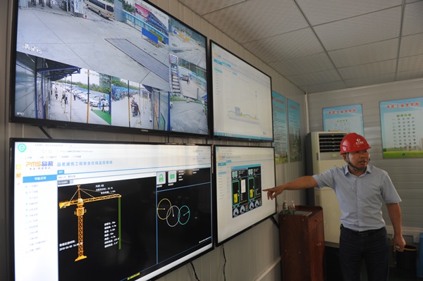 位于項目部會議室的“信息指揮中心”,正是智慧工地的“大腦”。墻壁上四塊電視屏幕顯示著工地內(nèi)實時視頻和各種數(shù)據(jù)。施工單位負責(zé)人介紹,通過工地內(nèi)分布的監(jiān)控攝像頭和傳感器,所傳出的視頻和采集的數(shù)據(jù)全部集中到平臺展示,而這些控制點主要分布在作業(yè)層、塔吊、施工電梯等存在安全隱患的部位,便于對現(xiàn)場全方位、全天候監(jiān)督管理。