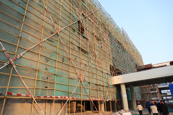 在北師大鹽城附校初中、高中部禮堂施工現(xiàn)場(chǎng),檢查組發(fā)現(xiàn)禮堂外墻腳手架存在安全網(wǎng)破損和橫桿變形問(wèn)題,責(zé)令現(xiàn)場(chǎng)項(xiàng)目經(jīng)理立即落實(shí)整改。