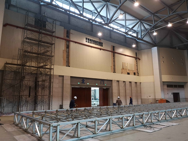 截至假期結束,項目現(xiàn)場三塊LED屏主體框架已基本完成,項目效果初現(xiàn);二樓會議大廳已完成頂部噴淋改造,舞臺燈具槽、吊頂及會場燈具正在安裝施工中,整體工程力保5月15日前順利交付使用。
