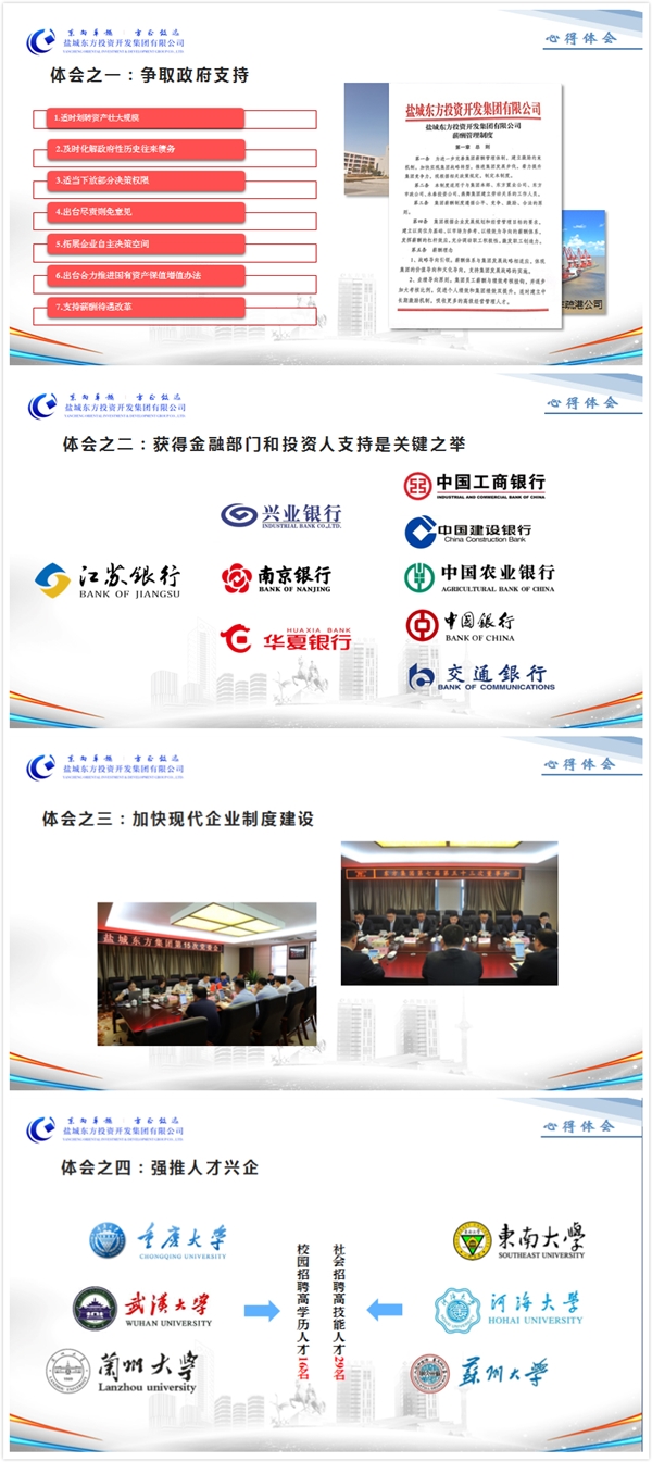 鹽城東方轉(zhuǎn)型發(fā)展除了內(nèi)生動力得到充分激發(fā)、把準(zhǔn)了幾個重要機遇外,還得益于黨委、政府的堅強領(lǐng)導(dǎo),更得益于和像江蘇銀行這樣的金融機構(gòu)的鼎力扶持。主要心得體會有:一是爭取政府支持是重要保障。二是獲得金融部門和投資人支持是關(guān)鍵之舉。三是加快現(xiàn)代企業(yè)制度建設(shè)是有力支撐。四是強推人才興企是轉(zhuǎn)型根本。