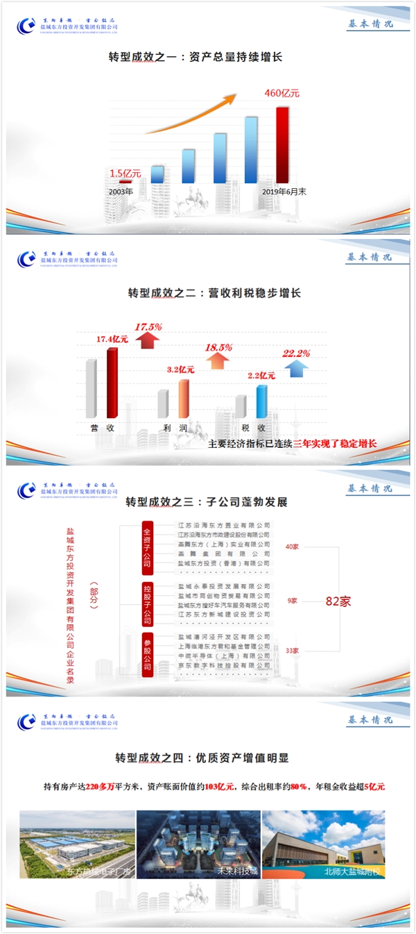 從基本情況來看,鹽城東方集團經(jīng)過16年的發(fā)展,目前已從單純政府投融資平臺,向市場化、實體型、投資型、效益型、品牌型實業(yè)國有企業(yè)轉(zhuǎn)型。十多年來,鹽城東方集團強推“六化”促轉(zhuǎn)型,謀求發(fā)展高質(zhì)量。即以穩(wěn)增長為導(dǎo)向、加快規(guī)模化擴張,以走出去為動能、提速外向化開拓,以調(diào)結(jié)構(gòu)為引擎、激活高效化混改,以主板塊為支撐、強推實體化運行,以防風(fēng)險為保障、加速規(guī)范化進程,以創(chuàng)特色為方向、加快品牌化塑造,主要取得四個方面的轉(zhuǎn)型成效:一是資產(chǎn)總量持續(xù)增長。二是營收利稅穩(wěn)步增長。三是子公司較快發(fā)展。四是優(yōu)質(zhì)資產(chǎn)增值明顯。