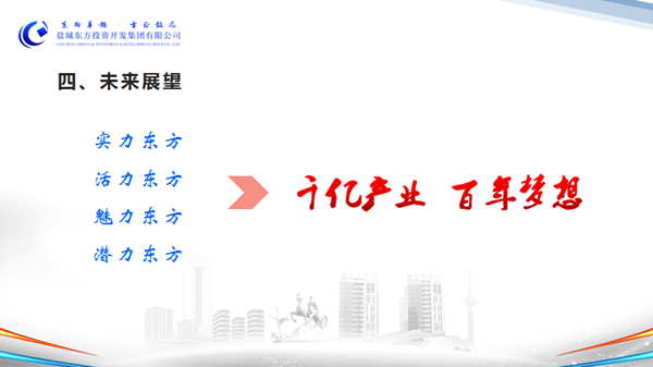 當(dāng)前,鹽城東方集團所在的鹽城經(jīng)開區(qū),恰逢國務(wù)院和省、市政府全力支持推進中韓(鹽城)產(chǎn)業(yè)園建設(shè)的黃金機遇,在“天時、地利、人和”的難得良機前,對于未來,東方集團將堅定不移地選擇主動轉(zhuǎn)、穩(wěn)健轉(zhuǎn)、高效轉(zhuǎn),樹立打造“千億產(chǎn)業(yè)•百年夢想”美好愿景。