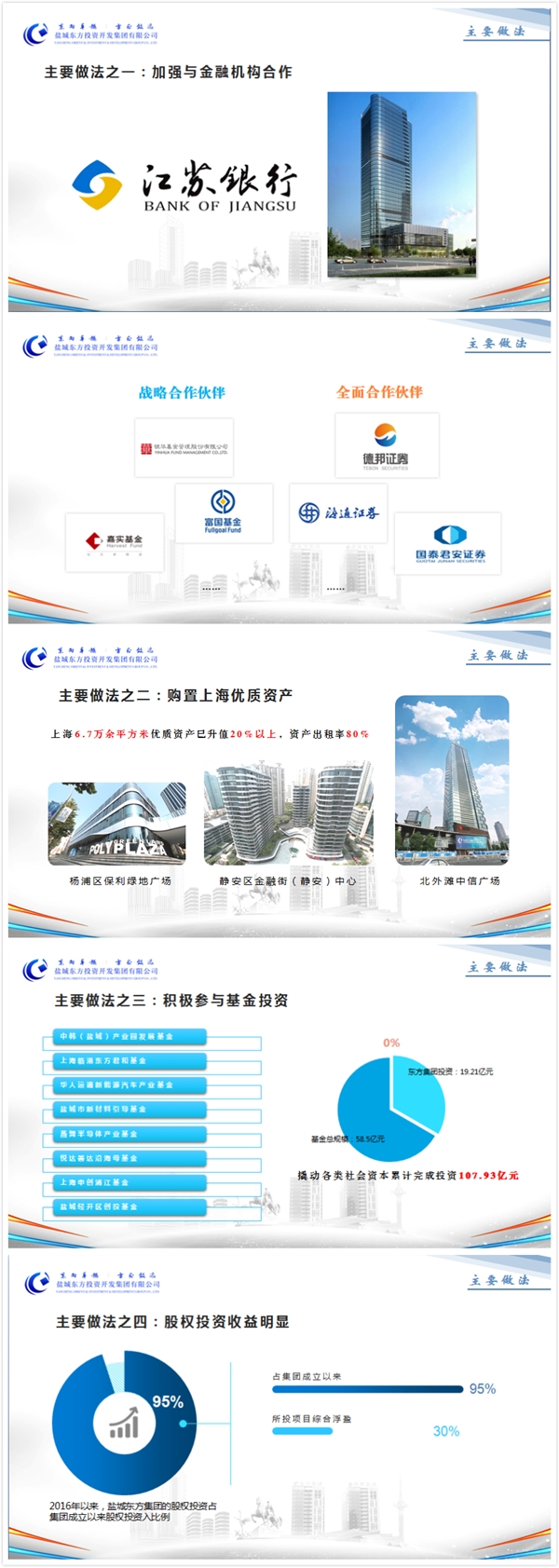 近三年以來,鹽城東方集團圍繞產(chǎn)業(yè)化、實業(yè)化、市場化追求,主動接軌上海、加快投資步伐、謀求多元發(fā)展,初步展現(xiàn)提質(zhì)增效、轉(zhuǎn)型創(chuàng)新的綜合成效和后發(fā)優(yōu)勢。主要做法有:一是加強與金融機構(gòu)合作。二是購置上海優(yōu)質(zhì)資產(chǎn)。三是積極參與基金投資。四是股權(quán)投資收益明顯。五是子公司市場化發(fā)展。六是收購上市公司與啟動自主上市。