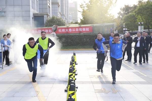 15:00分,隨著集團大樓火警鈴聲的響起,集團各部門、子公司人員在物業(yè)客服人員的引導(dǎo)下,口捂濕毛巾從各樓層安全通道低聲有序撤離至亞朵酒店門前廣場,參加本次宣傳日專題活動。