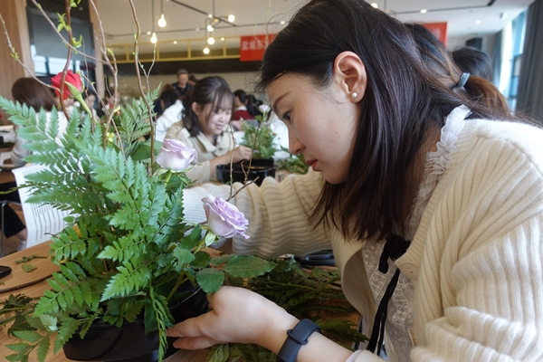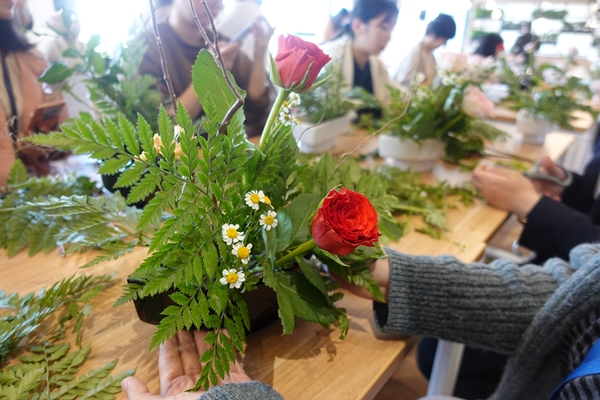 活動(dòng)開始后,花藝?yán)蠋煘榇蠹医榻B日式插花的基礎(chǔ)知識(shí),展示了一些經(jīng)典日式插花作品,同時(shí)還教授了日式插花的方法和各種小技巧。日式插花講究的是“空、寂、靜”,用最適合的花材體現(xiàn)花、葉、器的線條之美,以簡(jiǎn)為榮,正符合了東方集團(tuán)清風(fēng)正氣的文化底蘊(yùn)。