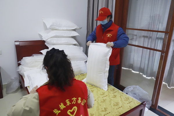 不僅要有不舍晝夜、爭分奪秒的拼勁,還需要細致到位、設身處地的后勤保障。次日清晨,隨著一車車從外地緊急調(diào)集的400套物資的陸續(xù)抵達,現(xiàn)場人員立馬上前進行卸貨與盤點。一大早,集團又調(diào)集20多名志愿者前往韓國社區(qū),以流水線形式將被褥、臉盆、毛巾等生活物品裝套分配打包,再將各類物資分發(fā)至隔離點每個房間,用心用力保障到位。夜里拼進度、白天拼細節(jié),既拼出了“東方速度”,更展現(xiàn)了“東方溫度”。