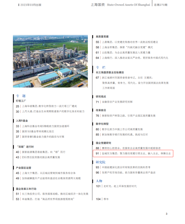 近日,《上海國資》雜志再次聚焦東方集團(tuán),通過在2023年第3期“國企黨建研究”專欄發(fā)表題為“鹽城東方集團(tuán):聚力推動(dòng)黨建引領(lǐng)主業(yè)、融入主業(yè)、保障主業(yè)”調(diào)研文章,深度報(bào)道了東方集團(tuán)通過大力實(shí)施黨建促主業(yè)“333”工程,推動(dòng)黨建工作與經(jīng)營發(fā)展深度融合,把黨建優(yōu)勢(shì)轉(zhuǎn)化為企業(yè)高質(zhì)量發(fā)展的制勝優(yōu)勢(shì),為奮力實(shí)現(xiàn)勇當(dāng)國企高質(zhì)量轉(zhuǎn)型發(fā)展標(biāo)桿目標(biāo)奠定了堅(jiān)實(shí)的基礎(chǔ)。