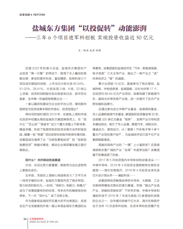 《江蘇國資研究》刊文丨鹽城東方集團“以投促轉”動能澎湃