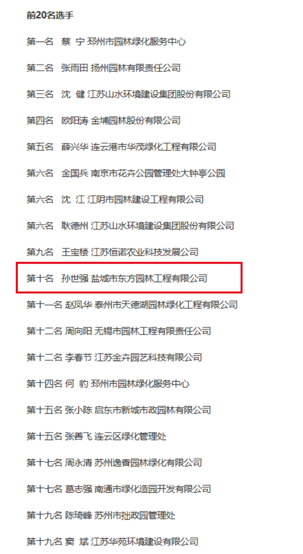 近日,由江蘇省住房城鄉(xiāng)建設(shè)廳、省總工會、省教育廳聯(lián)合主辦,省人力資源社會保障廳指導的2023年度江蘇省百萬城鄉(xiāng)建設(shè)職工職業(yè)技能競賽“山水杯”綠化工決賽圓滿落幕。來自全省13個市的65名選手同臺競技,鹽城東方集團旗下鹽城市東方園林工程有限公司孫世強取得第十名的好成績,也是我市參賽選手唯一進入前20強接受表彰的代表。
