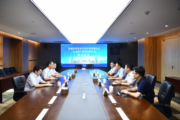 座談現(xiàn)場,吳江、余昭朋分別代表鹽城經(jīng)開區(qū)管委會和江蘇資產管理有限公司進行了合作簽約。