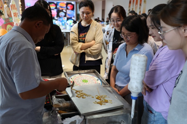 “非遺糖畫”體驗(yàn)區(qū)宛如一個(gè)時(shí)光寶盒,帶領(lǐng)大家開(kāi)啟一場(chǎng)沉浸式傳統(tǒng)技藝之旅。糖畫藝人以勺為筆、以糖為墨,在光潔的石板上揮灑自如,一滴滴金黃色糖液瞬間變成栩栩如生、各式各樣的有趣圖案。活動(dòng)現(xiàn)場(chǎng),大家也紛紛拿起畫筆用色彩斑斕線條在月球燈上勾勒出星空浩瀚,每一筆都蘊(yùn)含著對(duì)中秋美好祝福和未來(lái)生活的向往。