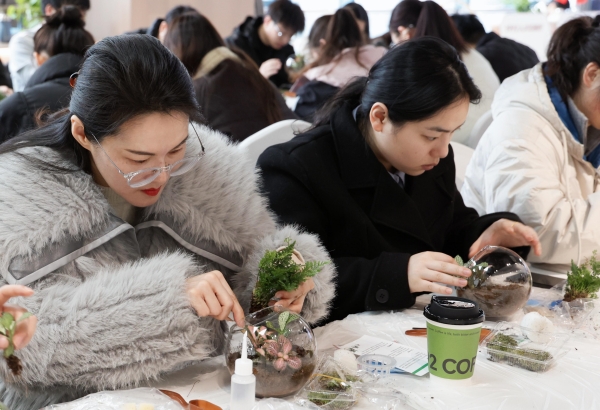 微景觀盆栽DIY成為本次活動最受追捧的環(huán)節(jié)。青年們把該活動作為傳遞綠色環(huán)保理念的獨特載體,充分發(fā)揮自己的創(chuàng)意和想象力,踏上了綠色環(huán)保藝術(shù)的奇幻之旅。他們將多肉植物、苔蘚與多種回收材料巧妙結(jié)合,成功打造出40多個生機盎然的“微型生態(tài)圈”,以藝術(shù)形式完美詮釋了環(huán)保智慧。