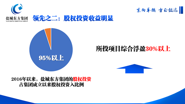 2016年以來,鹽城東方集團(tuán)立足區(qū)內(nèi)、瞄準(zhǔn)上海,先后高效推進(jìn)20多個(gè)股權(quán)投資項(xiàng)目,占集團(tuán)成立以來股權(quán)投資的95%以上。由于強(qiáng)化了前期盡責(zé)調(diào)查、中期風(fēng)險(xiǎn)防控、優(yōu)化投后管理,所投項(xiàng)目綜合浮盈超30%。