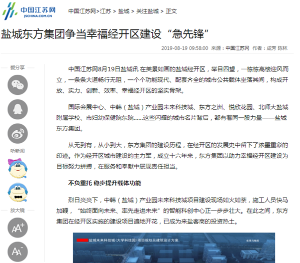 8月19日,中國江蘇網(wǎng)以《鹽城東方集團爭當(dāng)幸福經(jīng)開區(qū)建設(shè)“急先鋒”