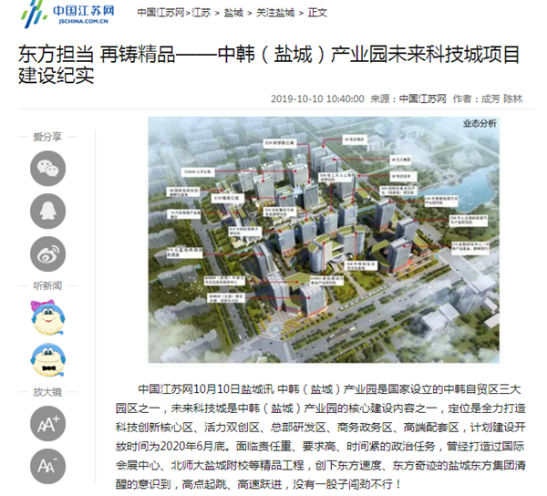 中韓(鹽城)產業(yè)園是國家設立的中韓自貿區(qū)三大園區(qū)之一,未來科技城是中韓(鹽城)產業(yè)園的核心建設內容之一,定位是全力打造科技創(chuàng)新核心區(qū)、活力雙創(chuàng)區(qū)、總部研發(fā)區(qū)、商務政務區(qū)、高端配套區(qū),計劃建設開放時間為2020年6月底。面臨責任重、要求高、時間緊的政治任務,曾經打造過國際會展中心、北師大鹽城附校等精品工程,創(chuàng)下東方速度、東方奇跡的鹽城東方集團清醒的意識到,高點起跳、高速躍進,沒有一股子闖勁不行!