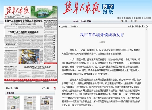 2016年,《鹽阜大眾報(bào)》頭版刊登鹽城東方集團(tuán)發(fā)行首期境外債。
