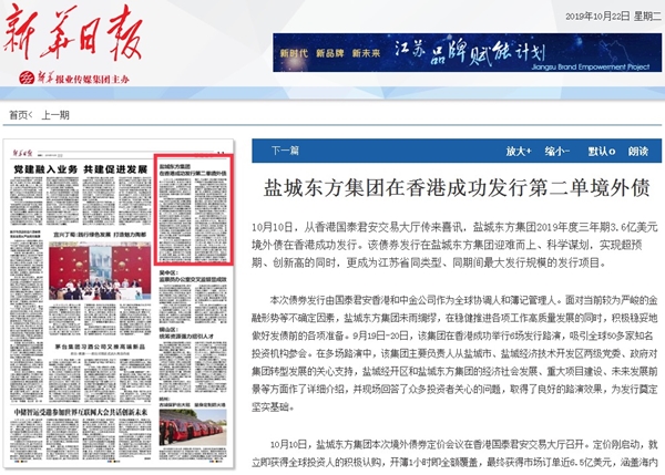 1022日,《新華日報(bào)》第11版顯著位置報(bào)道鹽城東方集團(tuán)成功發(fā)行第二單境外債,慶祝鹽城東方集團(tuán)近日在香港成功發(fā)行的2019年度3年期3.6億美元境外債,成為全省同類型、同期間最大規(guī)模的境外債發(fā)行項(xiàng)目。