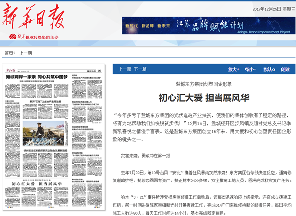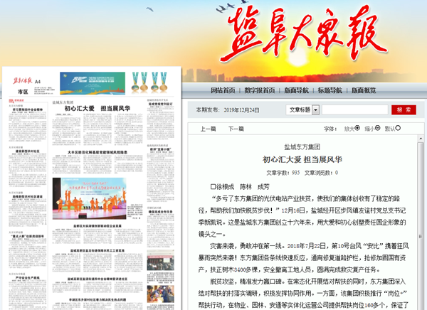 12月24日、25日,《新華日報》顯著版面重要位置、《鹽阜大眾報》A4版頭條,均以“初心匯大愛 擔當展風華”為主題,用生動的筆觸、鮮活的鏡頭,對鹽城東方集團積極踐行責任關(guān)懷進行了報道,充分彰顯了新時代的國企形象。