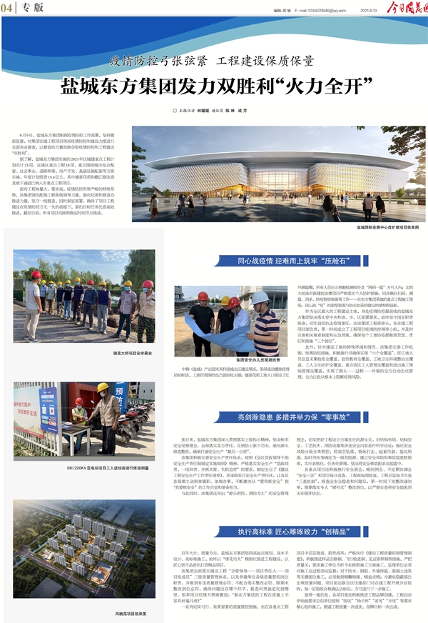 8月13日,今日開發(fā)區(qū)報(bào)以《疫情防控弓張弦緊 工程建設(shè)保質(zhì)保量——鹽城東方集團(tuán)發(fā)力雙勝利“火力全開”》為題,整版報(bào)道鹽城東方集團(tuán)疫情防控和工程建設(shè)“兩手抓、兩不誤”,奮力奪取“雙勝利”的主要舉措。